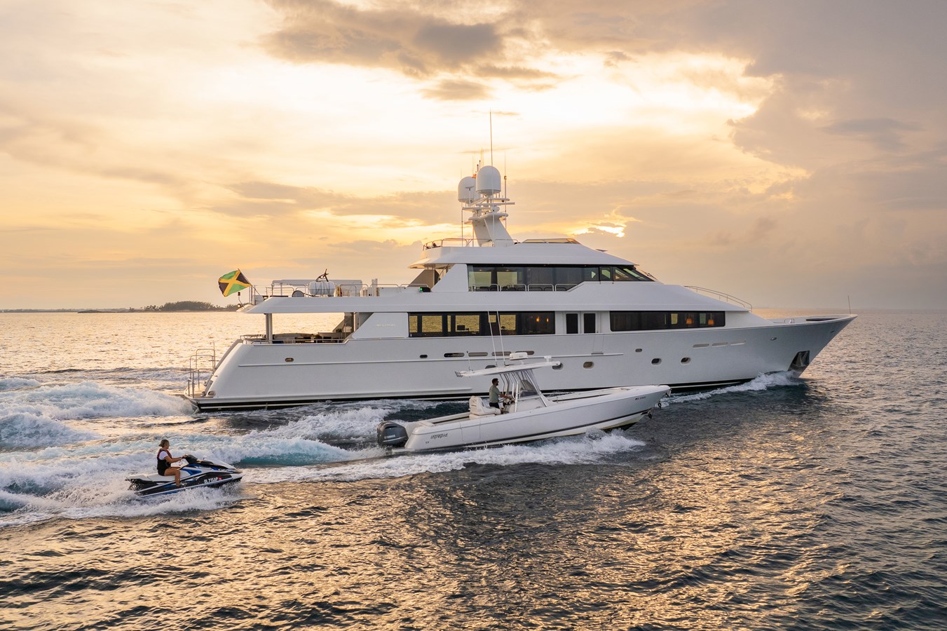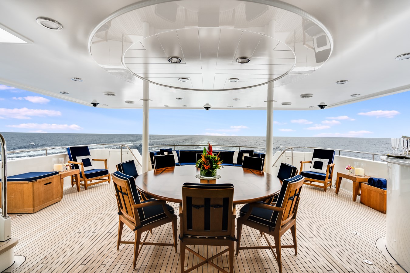 Her layout is designed for both comfort and entertainment, with a spacious main salon and separate dining area, a sky lounge with a games table and sit-up bar, and an expansive aft deck with circular dining, wet bar, and lounge seating. On the sundeck, guests can enjoy a Jacuzzi and sun pads with panoramic views.
