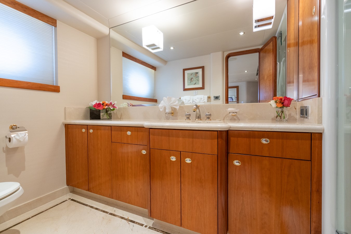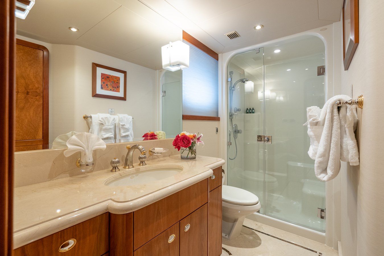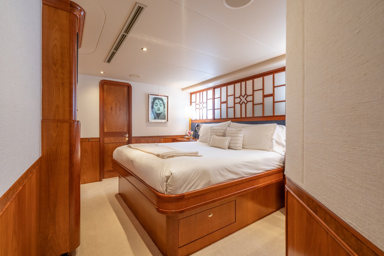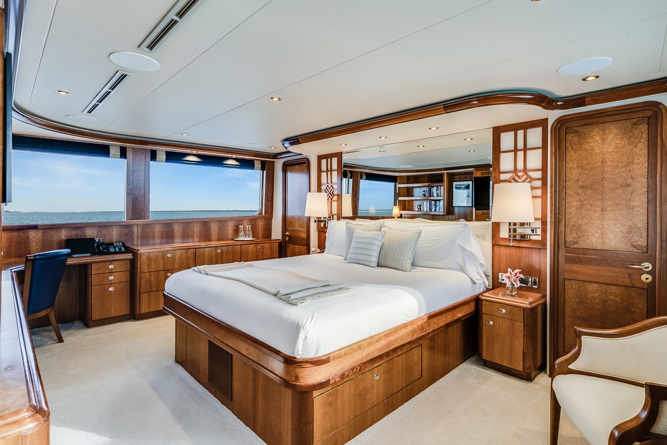 AVALINA accommodates 10 guests across five cabins, featuring a main deck master suite with queen bed and Jacuzzi tub, plus two doubles and two twins on the lower deck. Crew quarters allow for a team of seven. The cherry wood interior offers a warm and timeless aesthetic.