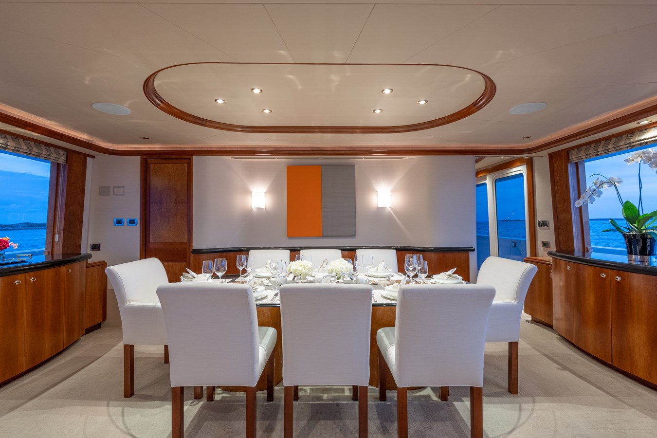 Powered by twin 2,735hp MTU engines, AVALINA reaches 24 knots and cruises comfortably at 13 knots. She is also equipped with Naiad 521 Stabilizers for extra comfort, underway and at anchor.