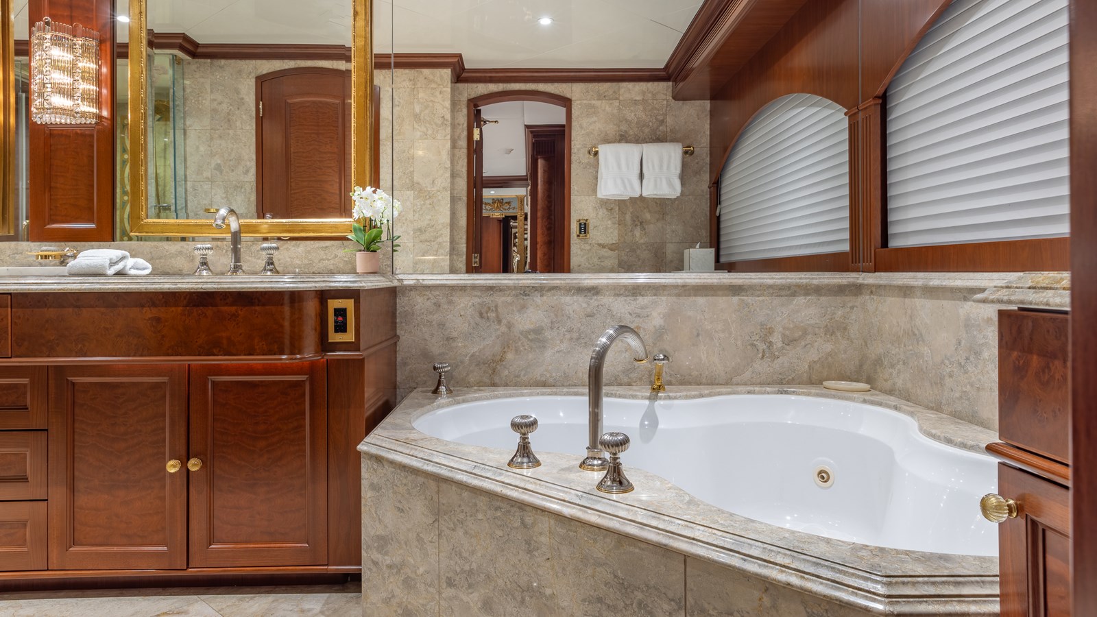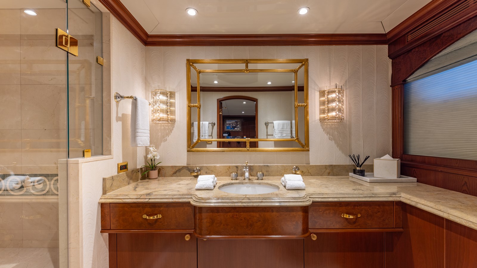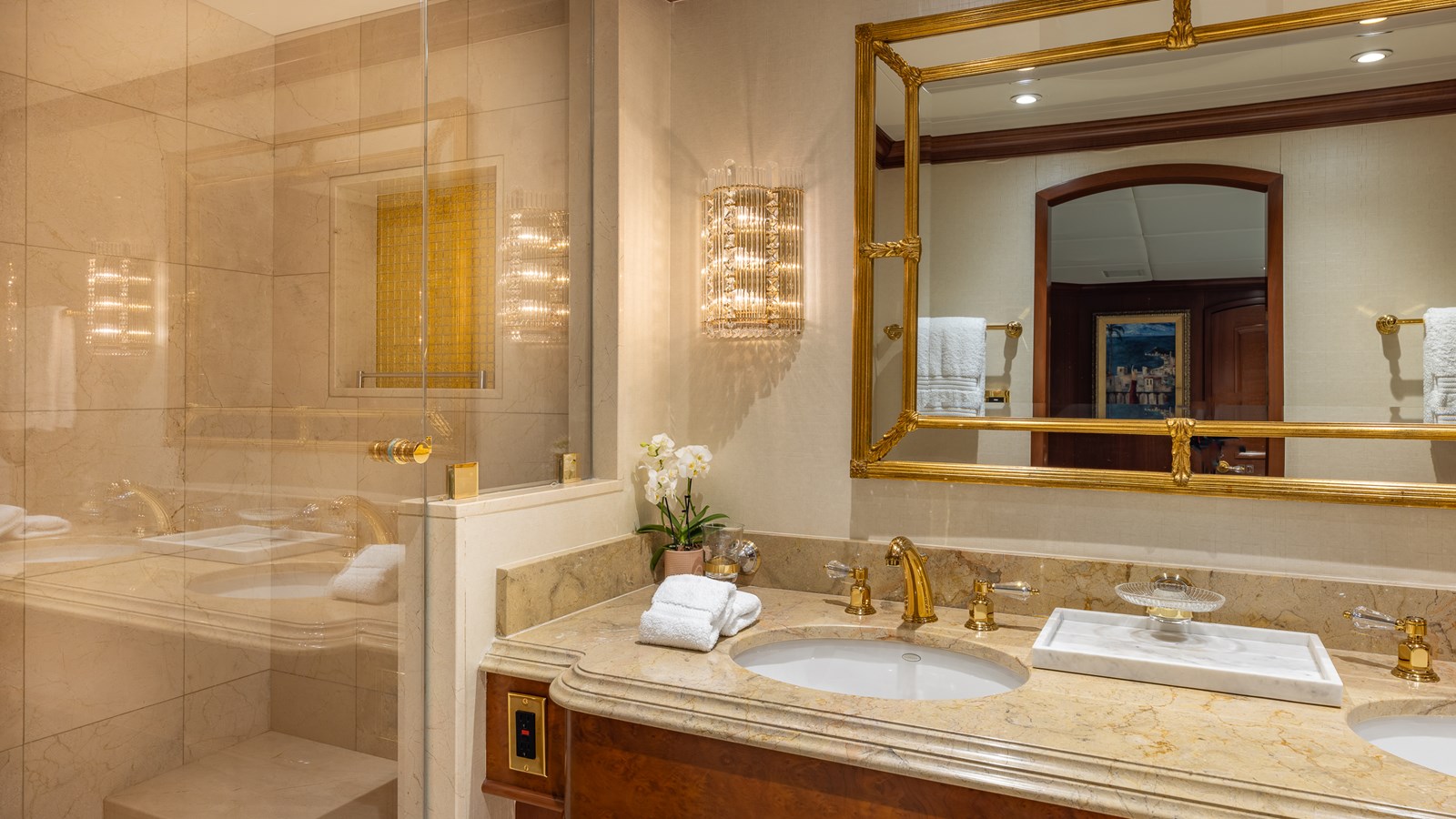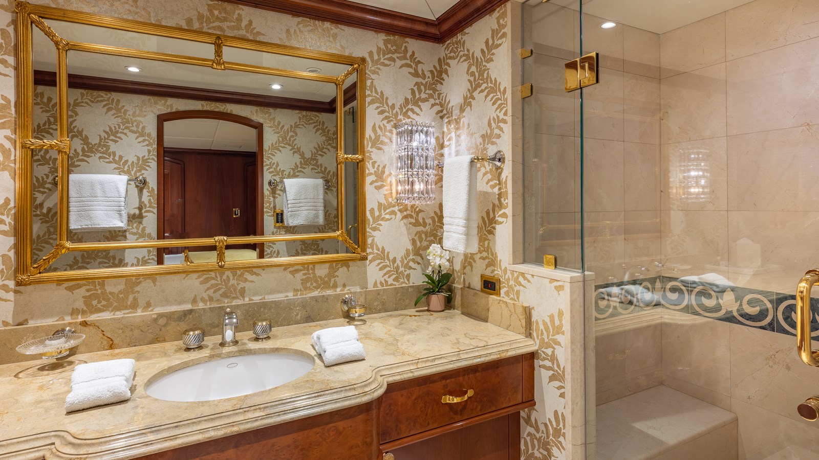 - Day head w/mahogany vanity w/marble top, custom gold-plated sink, Jado gold fixtures, custom mirror/marble overhead & wall panels & marble sole