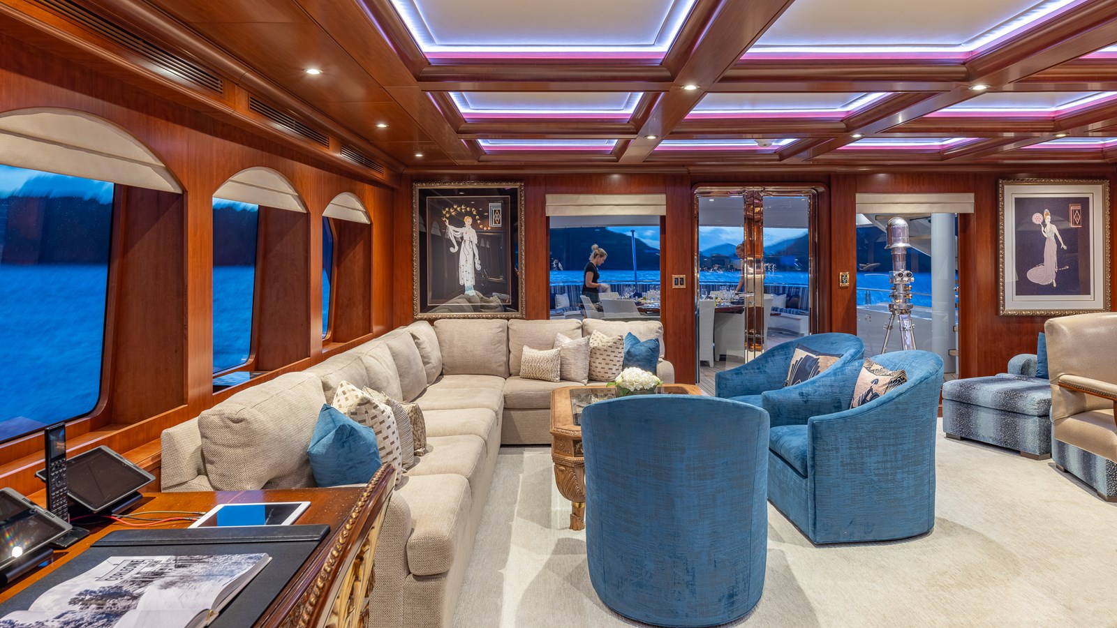 Entering the main salon from the spacious main aft deck, through offset double doors, you will notice a large, marble topped bar with four stools which faces the expansive teak planked aft deck. The formal dining room forward has an ornate buffet with lighted china cabinets and a pair of insets topped by gold leaf scallops.