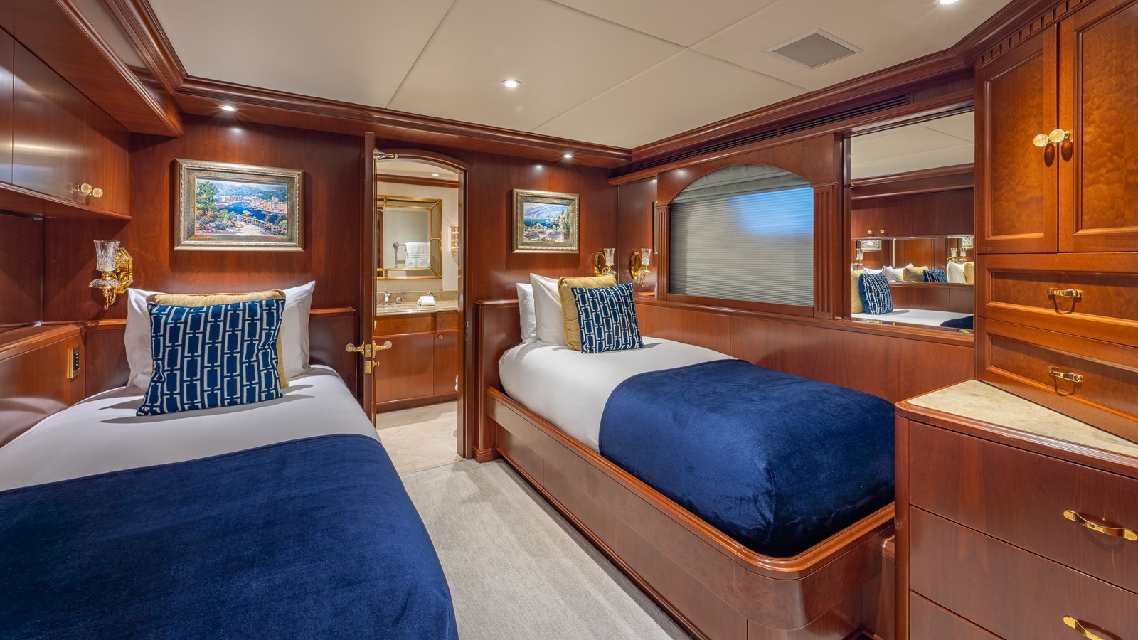 - Built-in nightstands & 3-drawer dressers w/marble top, port & stbd