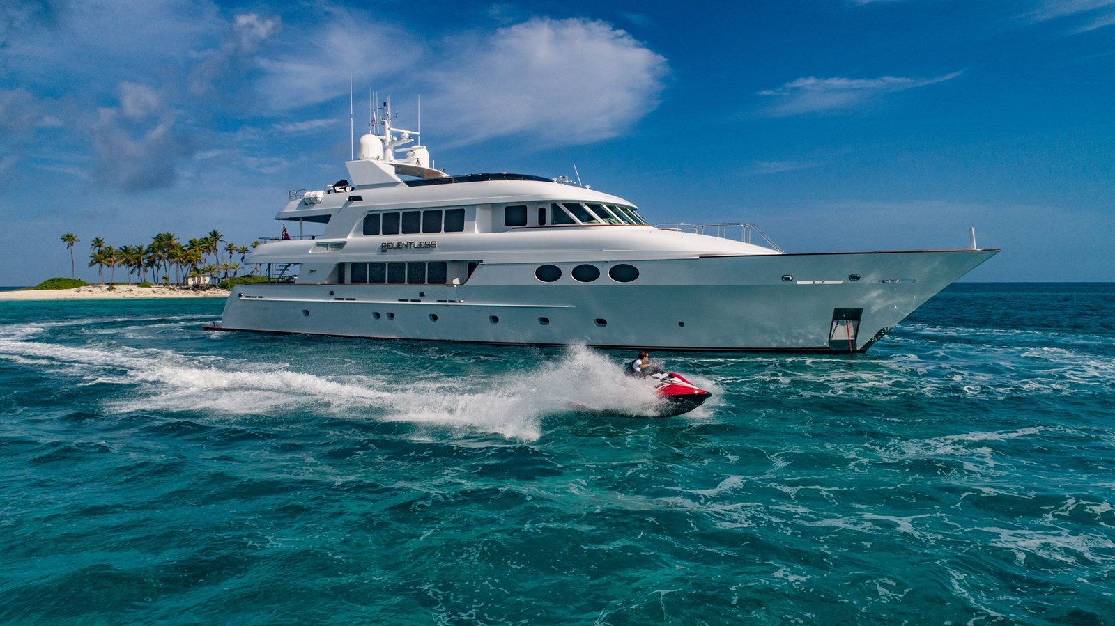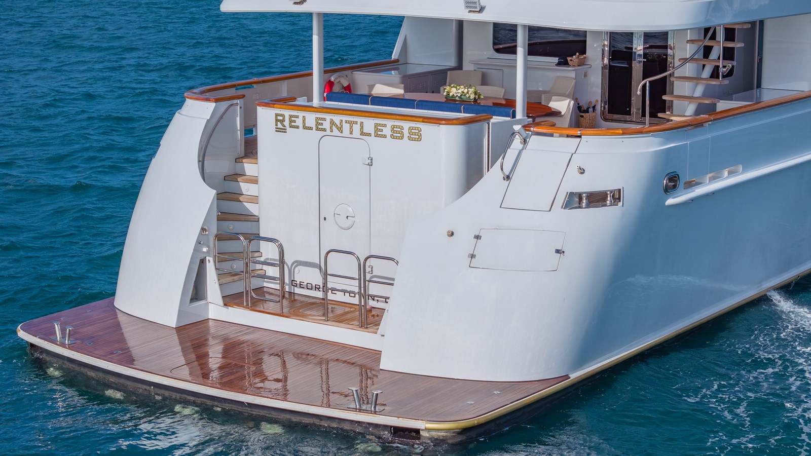 RELENTLESS features a five-stateroom layout with a full beam king master suite located on the main deck with the four additional guest staterooms below, all with ensuite baths. Additional amenities include a tastefully designed main salon, formal dining salon with Murano crystal fixtures, a commercial galley and an oversized aft deck.
